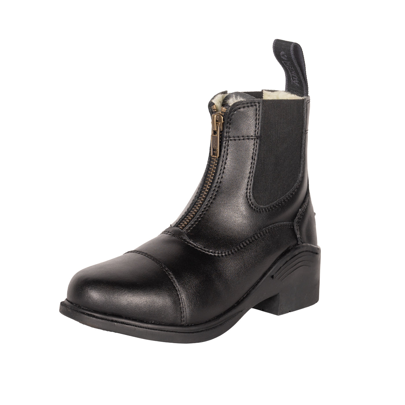 Help to keep kids feet warm all winter long, in or out of the saddle. Constructed from synthetic leather with a waterproof outer, allowing for wear in or out of the barn. Features a zip front for easy on and off with the addition of an elastic pull tab. Complete with a faux fur lining for added comfort and warmth, and a round toe.