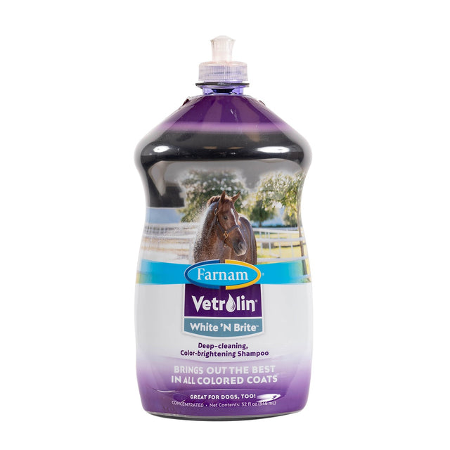 Vetrolin White ’N Brite Shampoo brings out the best in all coloured coats. This deep-cleaning, colour-brightening shampoo adds incredible brilliance to coats, manes and tails, while leaving your horse soft and shiny. Optical brighteners reflect light off the hair to accentuate the coat’s radiance. The gentle formula contains coconut oil derivatives to moisturize and increase absorption of brightening agents. This shampoo is an excellent spot remover, destroying even the worst manure stains quickly and easily. Concentrated formula that washes up to 16 horses. Great for dogs too! Packaged in a convenient squeeze bottle.