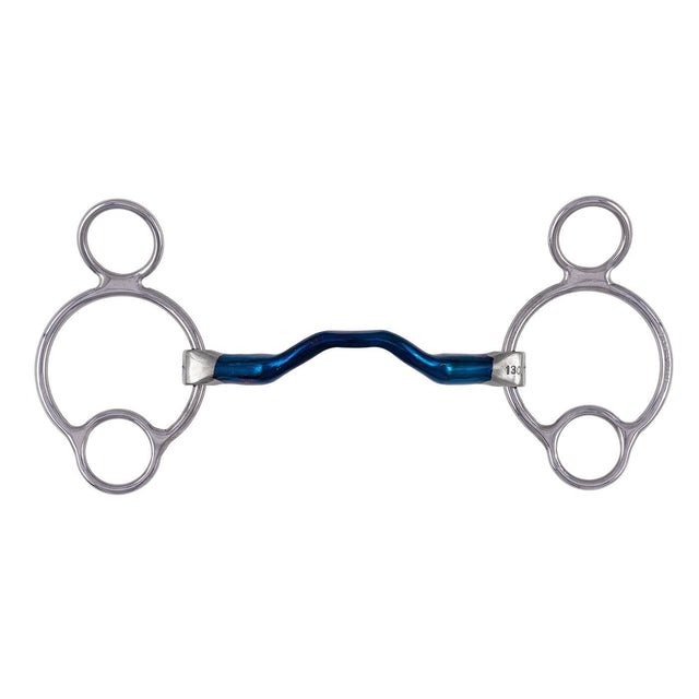 Created from blue sweet iron to help encourage salivation, the Bombers 2.5 Ring Happy Tongue Bit helps to introduce bit acceptance for horses with sensitive tongues. The solid, curved, medium port mouthpiece offers space for the tongue helping to relieve pressure and allow the horse to relax around the bit. Designed to introduce poll pressure while helping to provide softened leverage on the mouthpiece and poll. The blue sweet iron oxidizes easily and offers a warm, sweet taste to your horse. Two different rein placements allow the rider to adjust the amount of leverage provided.