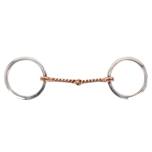 Flat, loose ring snaffle with copper wire twist. The loose ring gives mobility to the reins and copper encourages salivation.