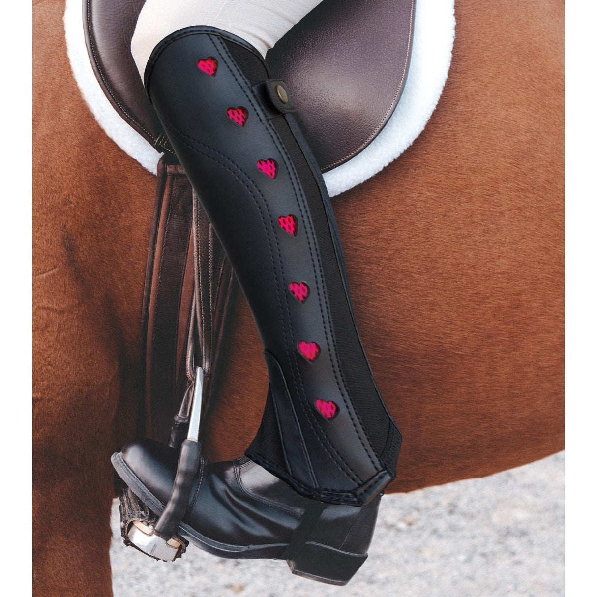 Spanish-cut half chaps with punched out hearts along the outside of the calf, constructed from super soft yet durable and easy-to-clean synthetic. Stretch panels at the back of the calf and over the bridge of the foot help enhance fit. Genuine YKK zippers at the back of the calf come complete with anti-rust brass snap closures at the top of the calf as well as the ankle for added security. Finished with a thick and durable under-shoe elastic.