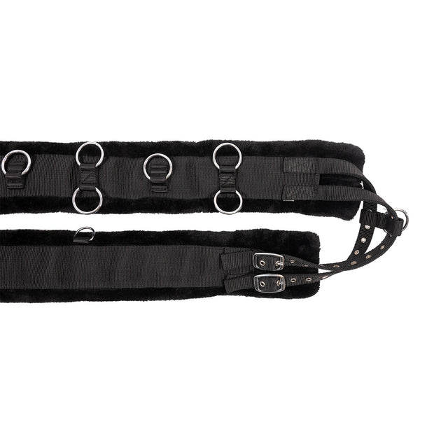 Durable nylon surcingle features a comfortable fleece lining and plenty of adjustability for use on multiple horses. 10 rings offer endless multiple attachment options for endless versatility.