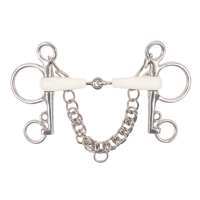 The Metalab Snaffle Mouth Flexi Pelham Bit is designed to combine the effects of a snaffle and curb and help encourage the horse to bend at the poll through pressure applied by the curb rein. Crafted from a premium quality stainless steel for optimal durability and featuring a softer, flexi plastic on the mouthpiece for enhanced comfort. Single-jointed snaffle mouthpiece and complete with a curb chain.