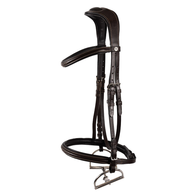 Featuring an anatomically designed, wider crownpiece with an innovative pressure-relief pad over the poll and a butter-soft leather lining. The noseband and browband are finished with detailed contrast stitching and comfortable padding. Buckle end cheekpieces with discreet leather keepers hold the bit in place. Sold without reins. Bit not included.