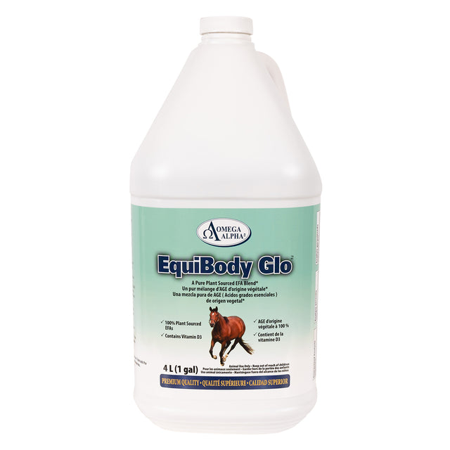 Omega Alpha's EquiBody Glo is an oral equine supplement that supports muscle and joint health, as well as hoof quality. It also promotes immune health, respiratory health, and healthy weight management. For oral use only.
