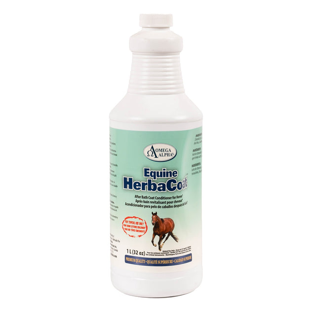 Omega Alpha Equine HerbaCoat is an after-bath lotion that contains several herbal oils to help condition and moisturize the skin and encourages a healthy, shiny coat. 1 L.