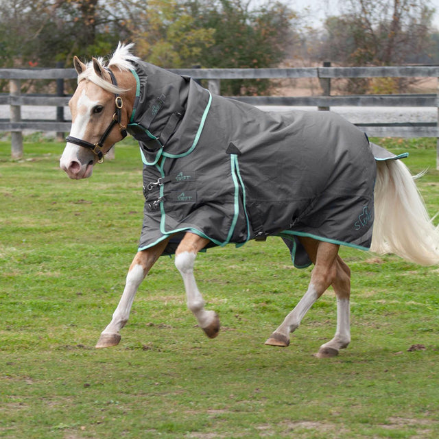 Waterproof and breathable, the Swift Rainsheet features a durable Teflon-coated 1200 denier outer shell with a 210T antibacterial lining to helps with odour control. An extended tail flap offers extra coverage while elasticized shoulder gussets help enhance freedom of movement and comfort for your pony. Complete with stretchy a tail cord and compatible with the Swift Hood (sold separately). 0 g fill.