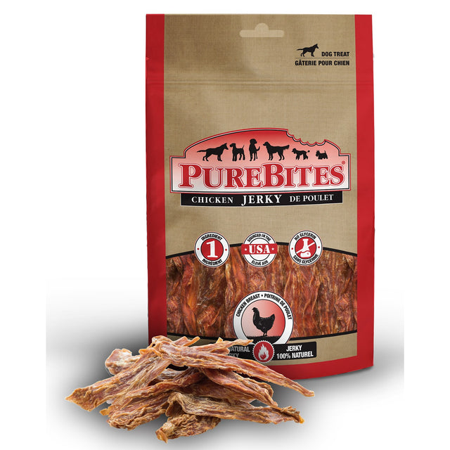 PureBites gently air dried chicken jerky dog treats are made with only 1 simple high-quality ingredient; 100% pure chicken breast. No artificial colors, fillers, sweeteners, or glycerin. Proudly sourced in the USA and made fresh & pure in Canada using a delicate air drying process at low temperatures which helps preserve fresh raw whole food, locking in the taste dogs crave and superior nutrition that pet parents love.