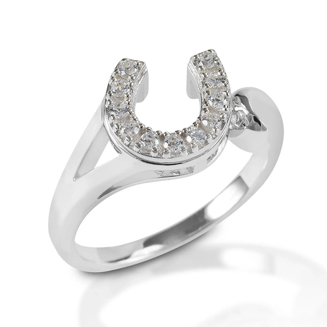 A stylish new take on an old classic, the Offset Horseshoe Ring tells the world you're a horse person in a fresh way. Lovely brushed sterling silver curves are set with dazzling colourless stones that play the light and catch the eye. Sure to be a lifelong favourite. Your beautifully hand crafted ring is made from .925 Sterling Silver and is protected with a rhodium plating. This plating helps add a rich elegant look and also provides a protective layer. Light reflective cubic zirconia stones and a brushed finish offer a refined sense of balance. The classic Western design is revisited for a feminine, modern appeal. Perfect for special occasion or casual wear!