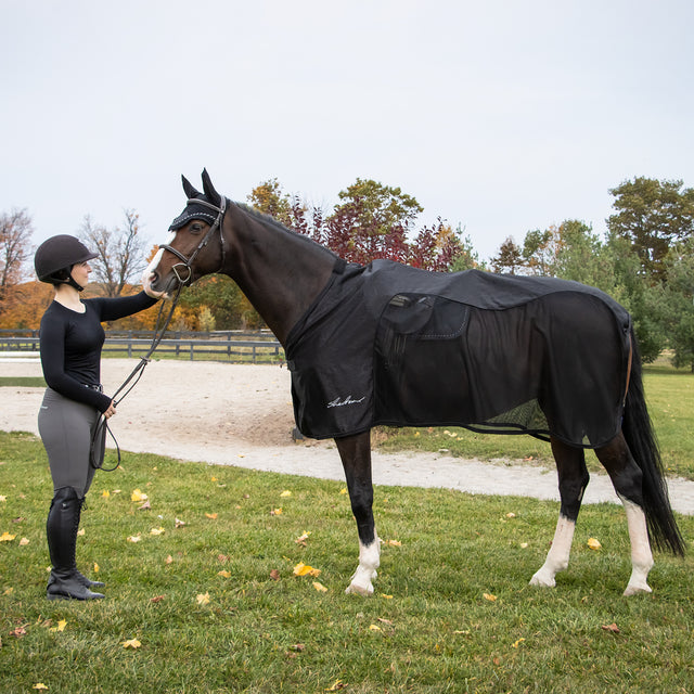 Suitable for standing ringside or while grazing on a nice summer day, Shedrow's Onyx Scrim offers an elegant and exclusive addition to your horse's wardrobe. Styled with a tone-on-tone satin print fabric with black piping. Complete with a wipe-clean tail cord, a t-bar front closure, and a faux-fur wither pad for added comfort.