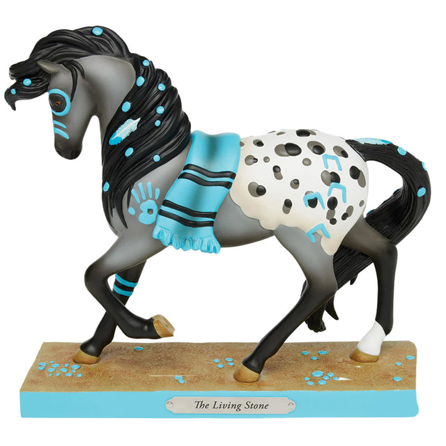 The Trail of Painted Ponies The Living Stone design features a striking horse decorated with vibrant turquoise tribal symbols, honouring the heritage of its rider's tribe. It beautifully captures the strength and connection between horse and rider.