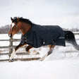 The Shedrow Turnout is the ideal everyday winter blanket. A waterproof yet breathable 1200 denier Ripstop shell is covered in a Teflon DuPont coating and lined with 210 denier nylon, offering both durability and comfort. A 150 g high grade poly fill keeps your horse warm and cozy while the deep shoulder gussets offer maximum freedom of movement. The cross-biased surcingles with rubber donuts feature stretchy elastic inserts for additional comfort and reinforced back up stitching for extra support. Two adjustable doubled-nylon front straps with quick release snaps help create a customized fit. Stretchy deluxe back leg straps help keep the blanket in place during all kinds of play. Overall double-stitched binding and reinforced stitching at all stress points help the Shedrow Turnout withstand all kinds of weather and wear. Complete with a reinforced tail cover and stylish contrasting trim.
