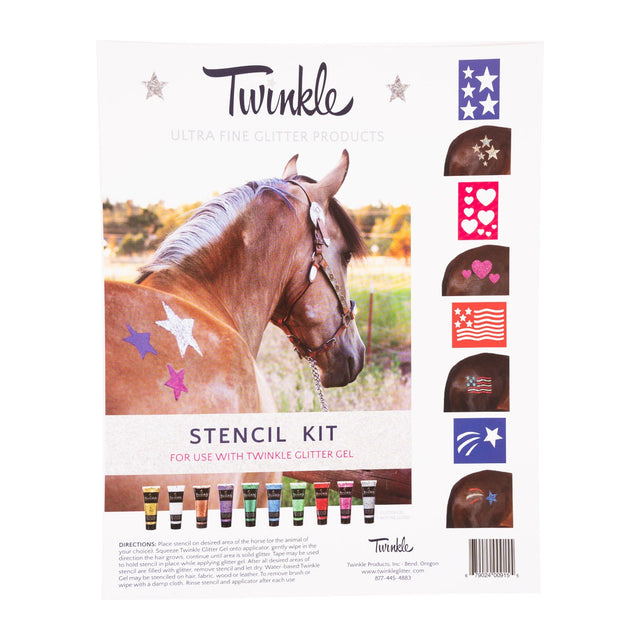 The Twinkle Glitter Traditional Stencil Kit is perfect for adding custom designs on your horse's hair. Includes three stencil sheets (stars, hearts and a shooting star with flag) as well as an applicator.