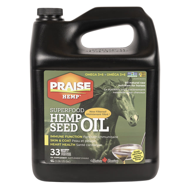 Adding Praise Hemp Oil to your pet's diet may support the immune system, digestion, energy, mobility, skin & coat, muscle health and cardiovascular health. Can be used for both dogs and horses. Do not use in horses intended for food. Made from filtered, 100% Canadian, non-GMO cold pressed hemp seed oil.