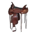 Designed for all-day riding comfort for both horse and rider, the Copper Canyon Trail Saddle is the ideal choice for every adventure. Crafted with beautiful cow leather in a dark oil finish, the lightweight yet strong tree is designed for the foundation-style horse that needs a wider fit from the shoulder to the rump. The cut-out skirt design helps offer closer contact while the long, adjustable fenders help eliminate bulk. Complete with a nylon cinch strap, 7/8 rigging, slotted conchos with saddle strings, and lightweight aluminum stirrups. Full QH Bars. Seat measures 14"L, skirt measures 25.5"L, channel measures 5.5"W. Weighs 26 lb. Due to the size of this item, an additional shipping fee applies.