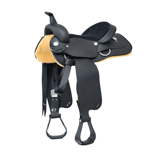 This synthetic saddle is constructed from lightweight material for added comfort for your horse. Features stainless steel hardware and semi quarter horse bars for horses with a more defined wither. Due to the size of this item, an additional shipping fee applies.