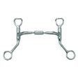 The Myler HBT Shank Bit W/ Wide Barrel features the MB 02 sweet iron mouthpiece, which oxidizes and encourages salivation. The MB 02 mouthpiece is the Myler alternative to the traditional French link or lozenge mouthpiece commonly used in snaffle bits. The MB 02 rotates onto the tongue, applying tongue pressure, but because the mouthpiece is curved, it wraps around the bars and lips instead of pinching. The barrel in the center applies approximately the same pressure on the tongue as a traditional three-piece mouthpiece, however, the barrel distributes the pressure more kindly and creates Independent Side Movement™. The HBT shank is stainless steel and has a slightly curved back, with a flat-top purchase and a rein ring. The mouthpiece has a fixed attachment style, while the shank has the patented Independent Swivel Cheek, where the purchase, mouthpiece, and shank all move independently of each other. The purchase is slightly angled away from the cheek to avoid rubbing. It has an indirect (curb) rein action designed to be used with a curb strap that attaches to the purchase. The HBT shank uses the combination of the fixed cheek and fixed rein to apply pressure to the mouth, chin, and poll.