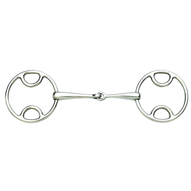 Ce bit permet d'offrir une action de levier douce. Lorsque le mors est engagé, les joues s'inclinent vers l'avant et soulèvent l'embout buccal, ce qui fait que le cheval ressent une pression simultanée sur la nuque et la bouche. Fabriqué en acier inoxydable et doté de joues équilibrées pour un confort optimal.