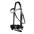 Bride de dressage élégante avec muserolle en cuir verni accrocheuse et frontal en cristal Swarovski avec un effet de vague subtil. Rembourrage en gel thermo-activé le long de la têtière, de la muserolle et du frontal conçu pour épouser la forme de la tête de votre cheval. La monocouronne et la muserolle de conception anatomique aident à réduire la pression pour un confort optimal. La muserolle à manivelle de conversion permet de retirer facilement le flash. Fabriqué à la main à partir du cuir de la meilleure qualité avec des montants en billettes et du matériel en acier inoxydable. Rênes non incluses.