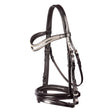 Bridon de dressage en cuir noir doté d'un frontal flatteur en cristal fendu pour un look élégant et accrocheur. Fabriqué avec des cristaux incrustés pour offrir une durabilité accrue. Complet avec un caveçon convertible avec un flash amovible et des ferrures à boucle. Rênes non incluses.