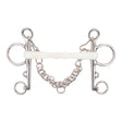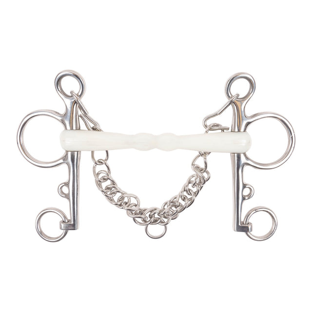 Le mors Metalab Mullen Mouth Flexi Pelham est conçu pour combiner les effets d'un filet et d'un trottoir, aidant à encourager le cheval à se plier au niveau de la nuque grâce à la pression appliquée par la rêne du trottoir. Fabriqué à partir d'un acier inoxydable de qualité supérieure pour une durabilité optimale et doté d'un revêtement en plastique flexible plus doux sur l'embout buccal pour un confort accru. Bouche Mullen droite et complète avec une chaîne gourmette.