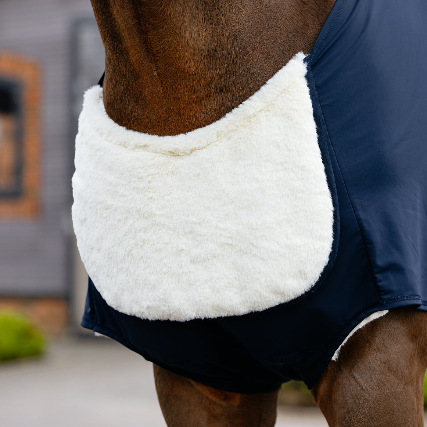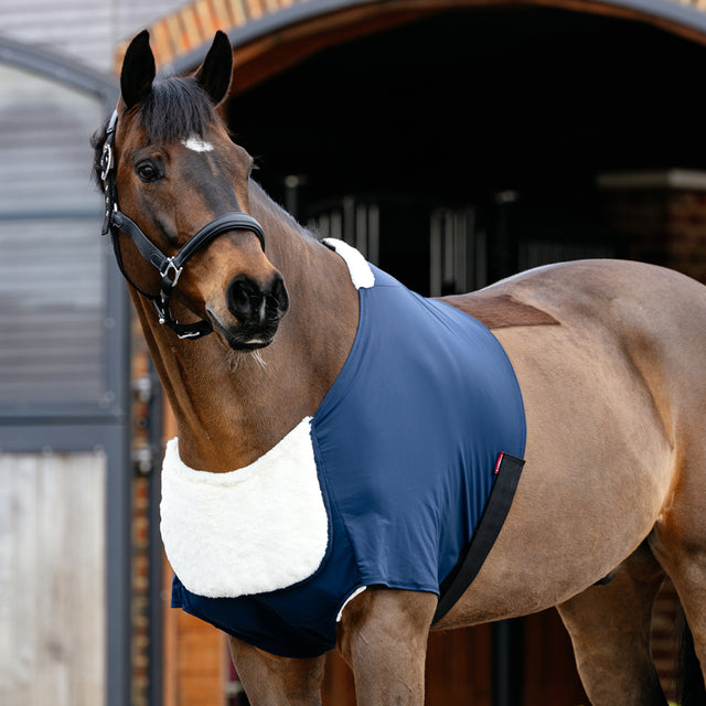 Protège le poitrail, les épaules et le garrot. Doté d'un rabat en fausse fourrure épaisse qui se replie sur le devant pour plus de confort à la base du cou. Livré avec une sangle ventrale élastique avec points réglables de chaque côté.