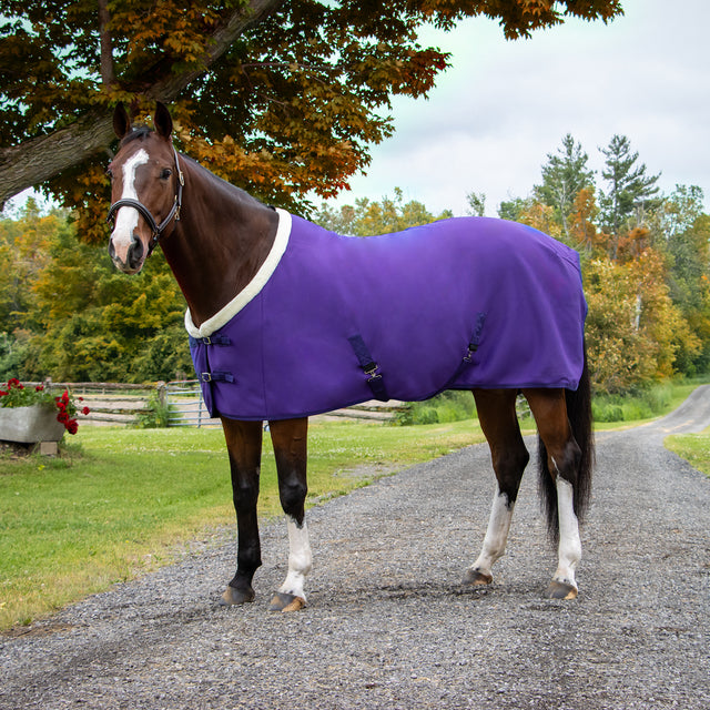 Superbe couverture légère en polyester brossé, dotée d'un col en fausse fourrure de vison unique qui élimine rapidement l'humidité du pelage de votre cheval avec élégance ! La fermeture avant à double boucle, les sangles croisées détachables et un cordon de queue accentuent la polyvalence de cette couverture confortable et adorable.