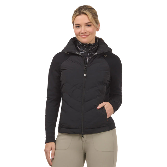 Une veste d'équitation matelassée flatteuse conçue pour vous garder au chaud et bouger avec vous en selle. La conception hybride associe une isolation haute technologie à une construction en tricot extensible sans couture, tandis qu'une doublure thermo-réfléchissante réchauffe votre corps en retenant la chaleur corporelle. Des coutures dynamiques et amincissantes et une silhouette féminine en font un choix élégant pour les vêtements d'intérieur et d'extérieur. Les manches raglan améliorent la mobilité et présentent un design à mors qui ajoute une touche équestre intelligente. Une capuche amovible isolée garde votre tête au chaud après la balade, assurant ainsi votre confort même lorsque la température baisse.