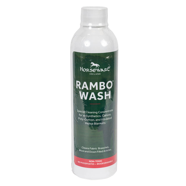 Rambo Wash est un détergent spécialement formulé, 100 % biodégradable, aux propriétés non toxiques et antibactériennes, doux pour les tissus, mais efficace contre la saleté et la crasse. Ce détergent doux est spécialement conçu pour nettoyer et entretenir vos couvertures, draps, bandages, coussinets et vêtements Horseware. Le liquide de lavage écologique illumine les couleurs et laisse les couvertures et accessoires de votre cheval propres et frais. Créé pour nettoyer une variété de tissus, notamment les synthétiques, le coton, la toile, le polyester, le polycoton, l'acrylique ou le denim. Peut également être utilisé sur le duvet, la laine, la polaire et d'autres fibres techniques.