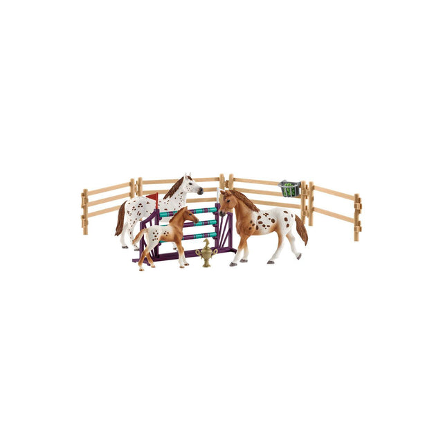 Aidez Lisa à entraîner ses Appaloosas pour le concours hippique ! Comprend une jument, un hongre et un poulain Appaloosa avec un enclos, un râtelier à foin, des pommes, un obstacle et un trophée. Modélisé avec les plus petits détails pour aider les enfants à apprendre tout en s'amusant. Convient aux 5-12 ans.