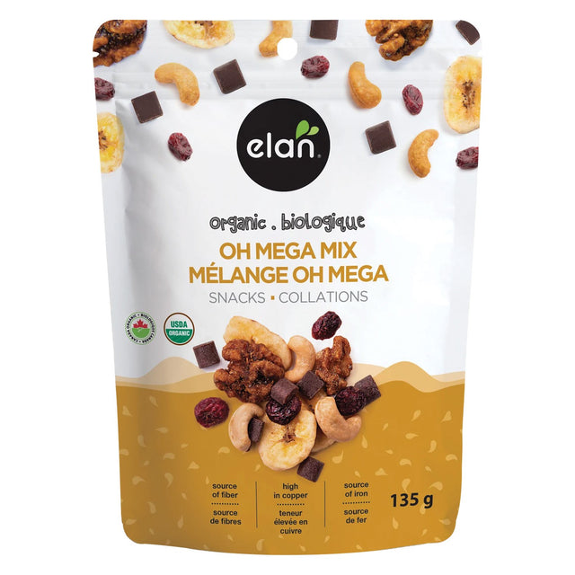 Elan Organic Oh Mega Mix offers a blend of rich, dark chocolate, cranberries, and dried banana chips, paired with roasted and salted cashews, and chia goji berry walnuts. Perfect for at home or on the go!